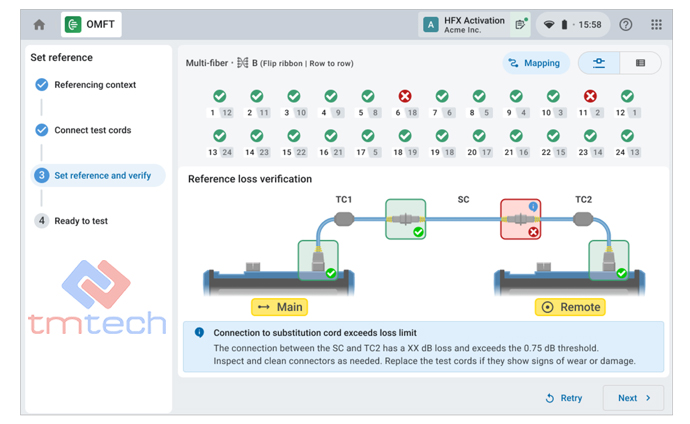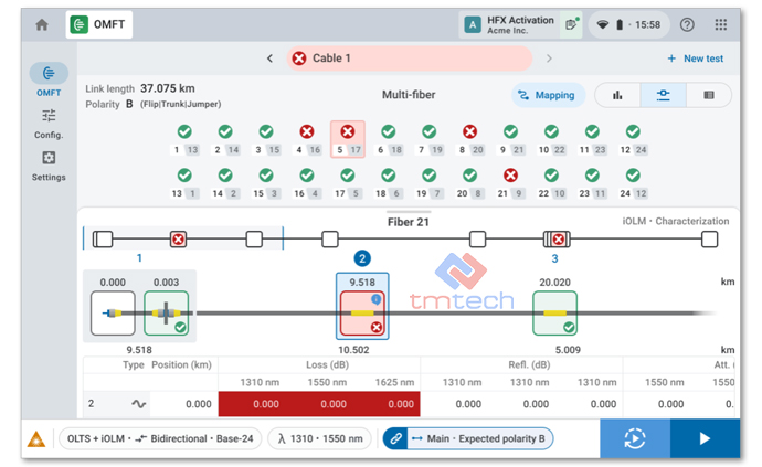 - Kiểm tra hai chiều Tier-1 OLTS: suy hao chèn (IL), suy hao phản xạ quang (ORL), đo chiều dài sợi quang và xác thực cực tính.